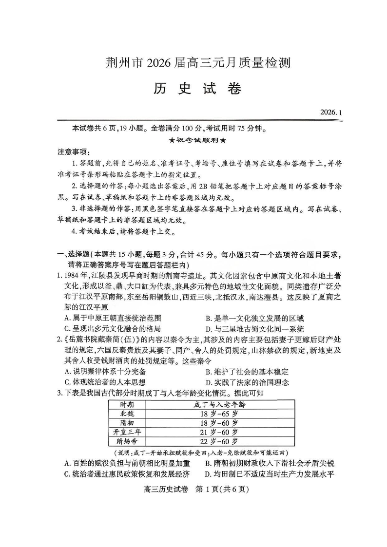 湖北省荆州、荆门、宜昌市2026届高三年级元月质量检测 历史试题(含答案).pdf