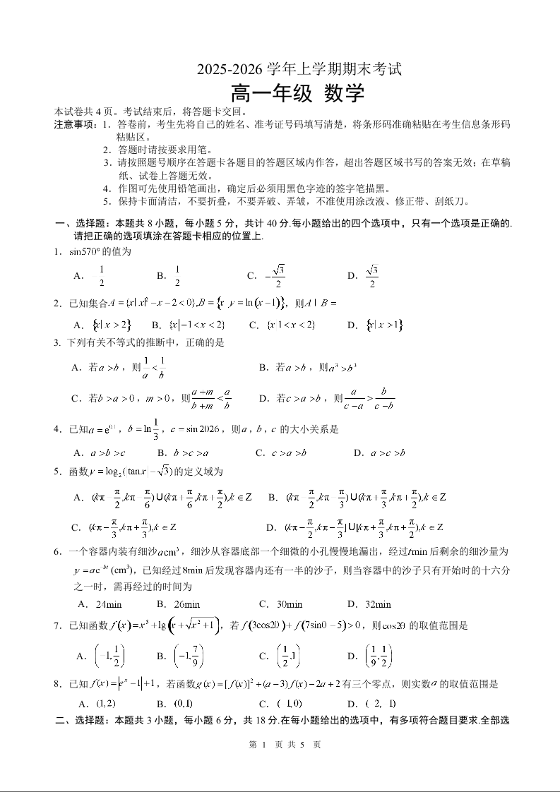 吉林省长春外国语学校2025-2026学年高一上学期期末考试 数学试题(含答案).doc