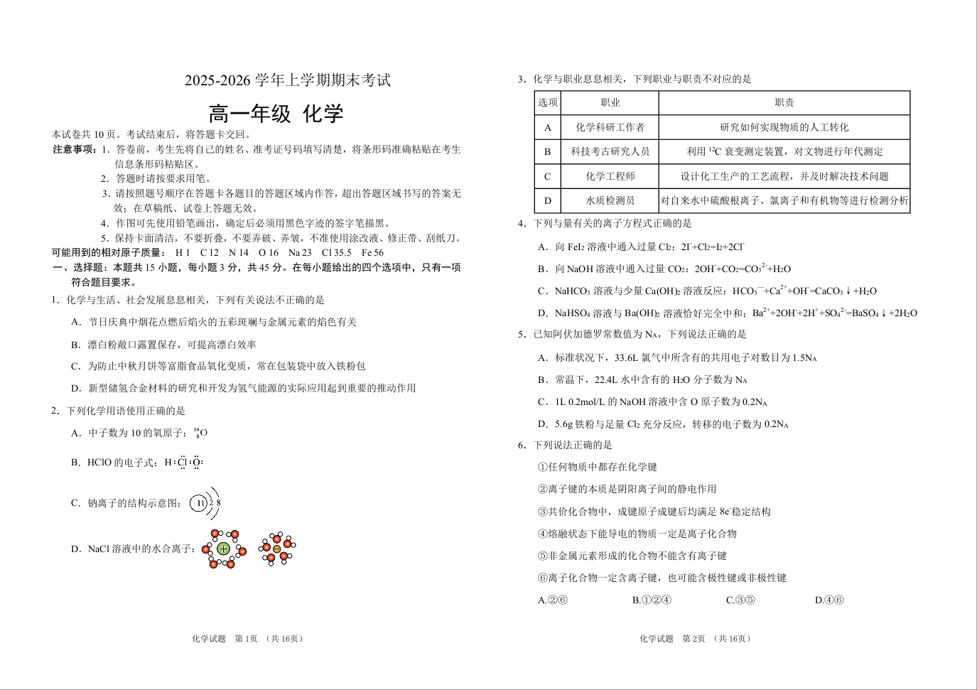 吉林省长春外国语学校2025-2026学年高一上学期期末考试 化学试题(含答案).doc