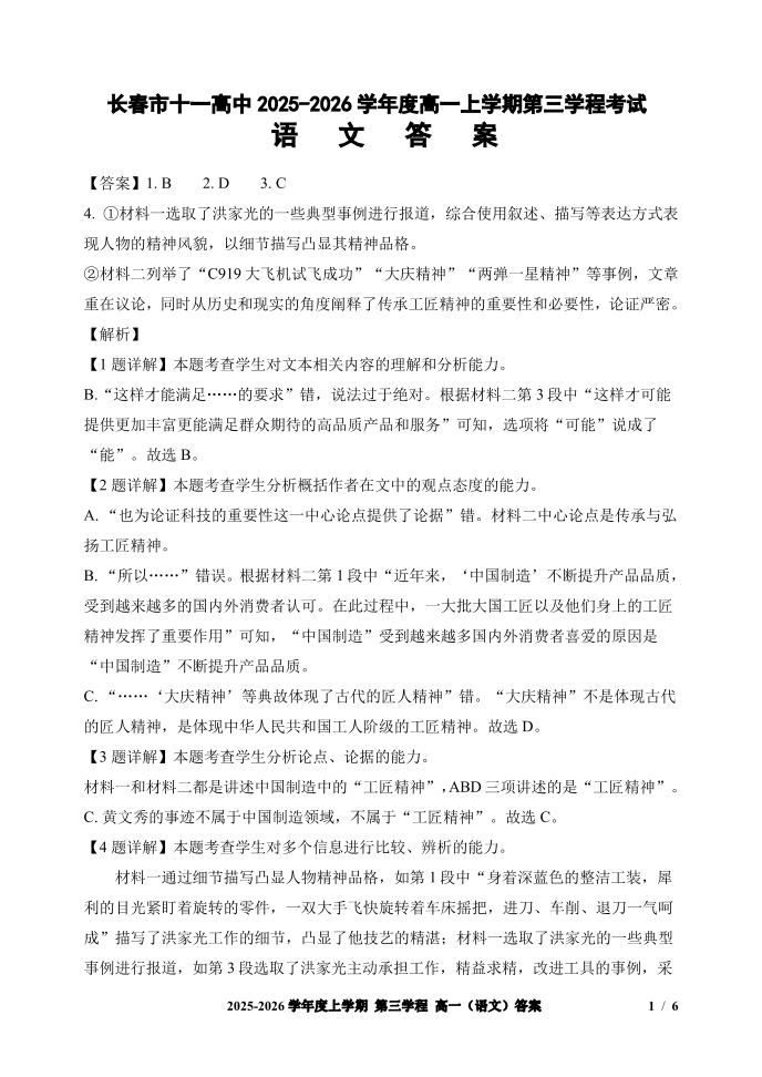 长春市十一高中2025-2026学年1月高一上学期第三学程考试 语文答案.pdf