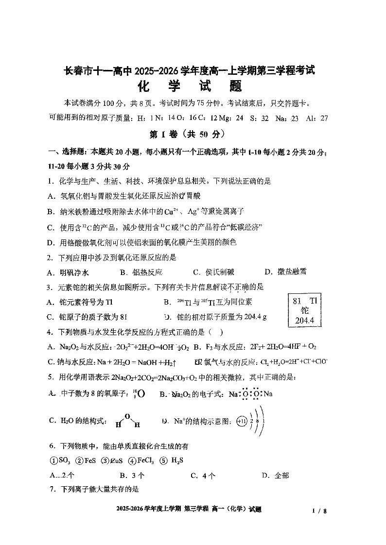 长春市十一高中2025-2026学年1月高一上学期第三学程考试 化学.pdf