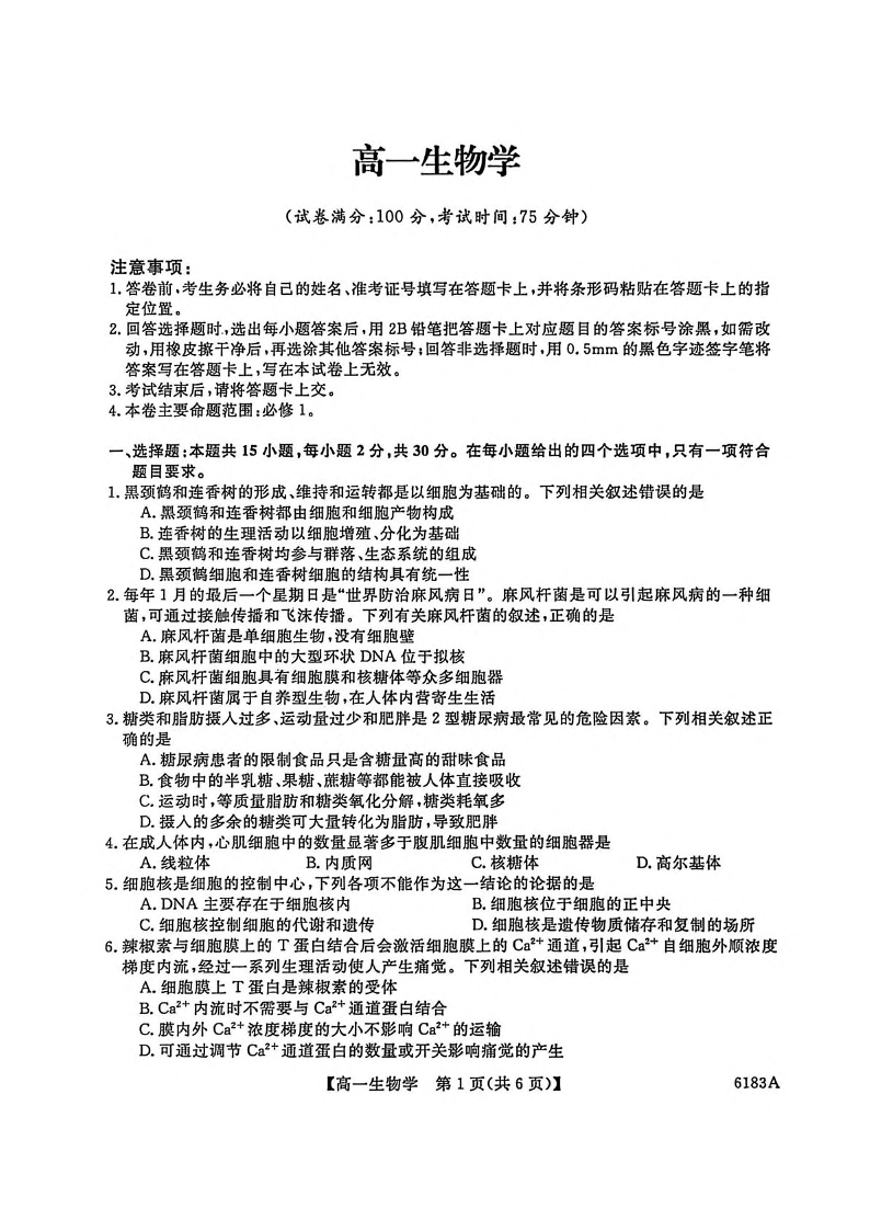 吉林市外五县2025-2026学年高一上学期1月期末考试 生物试题(含答案).pdf