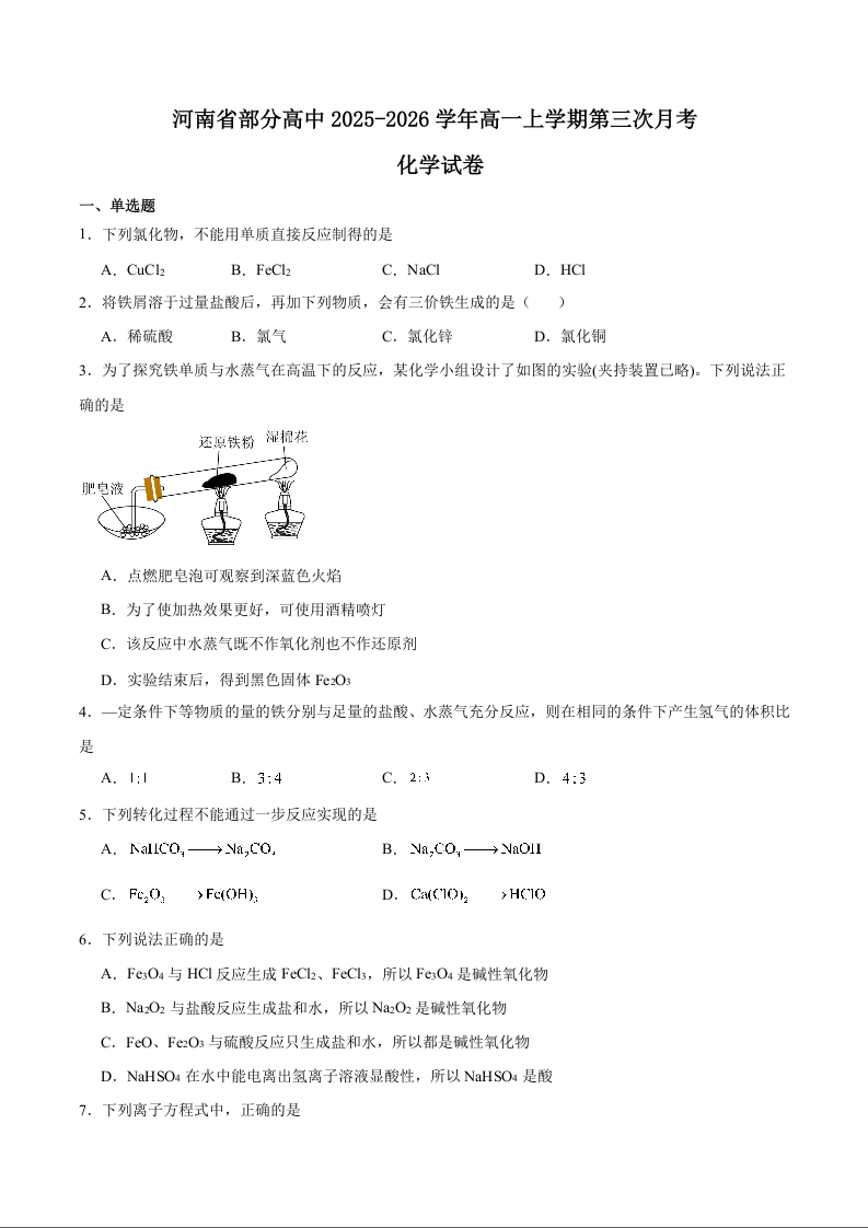 河南省部分高中2025-2026学年高一上学期第三次月考 化学试题(含答案).docx