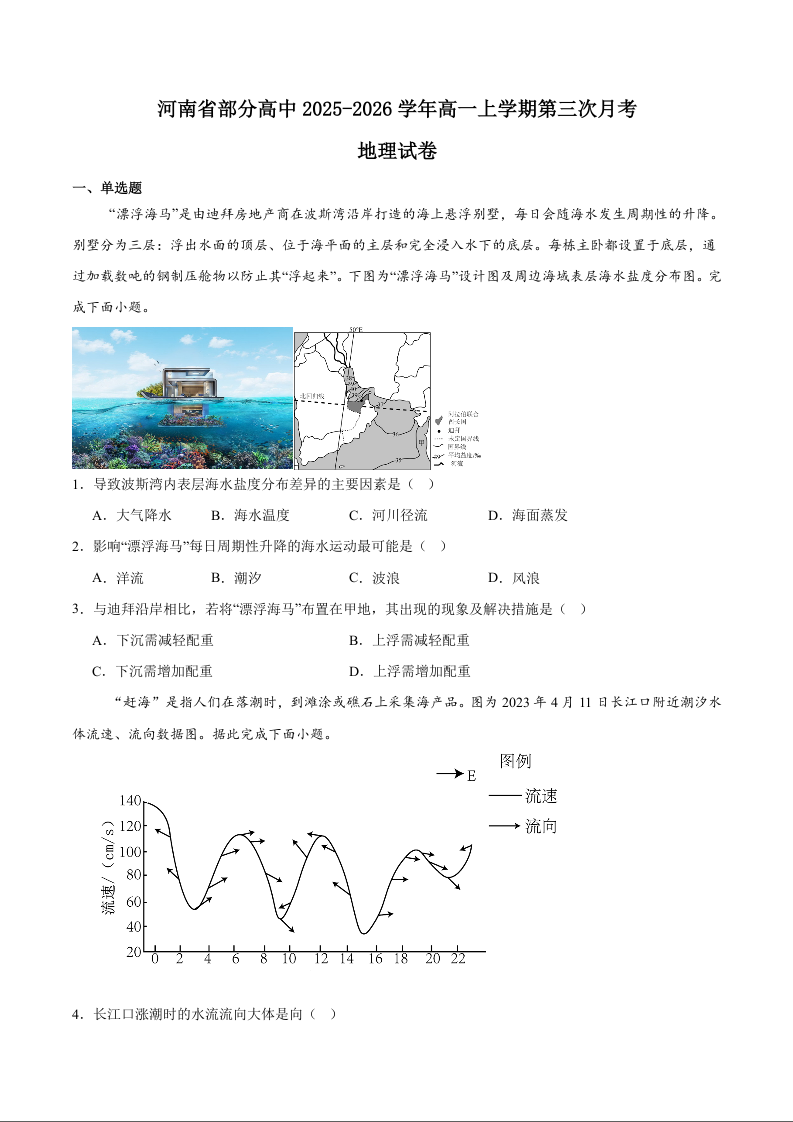 河南省部分高中2025-2026学年高一上学期第三次月考 地理试题(含答案).docx