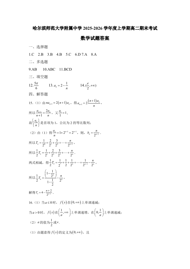 哈尔滨师范大学附属中学2025-2026学年上学期高二年级期末考试 数学答案.pdf