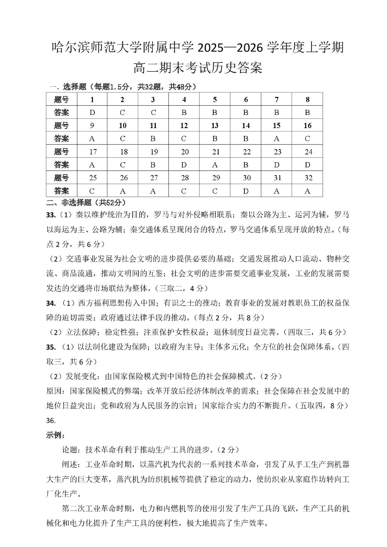 哈尔滨师范大学附属中学2025-2026学年上学期高二年级期末考试 历史答案.pdf