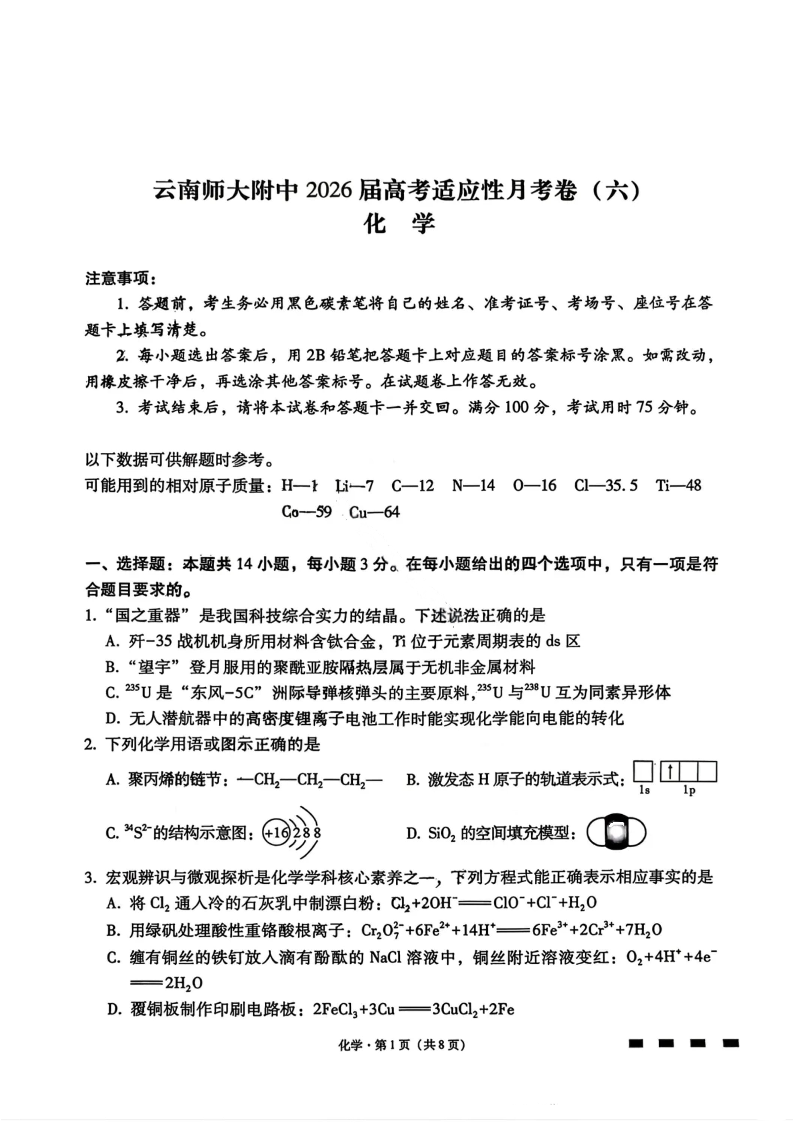云南师范大学附属中学2026届高三1月高考适应性月考卷(六) 化学.pdf