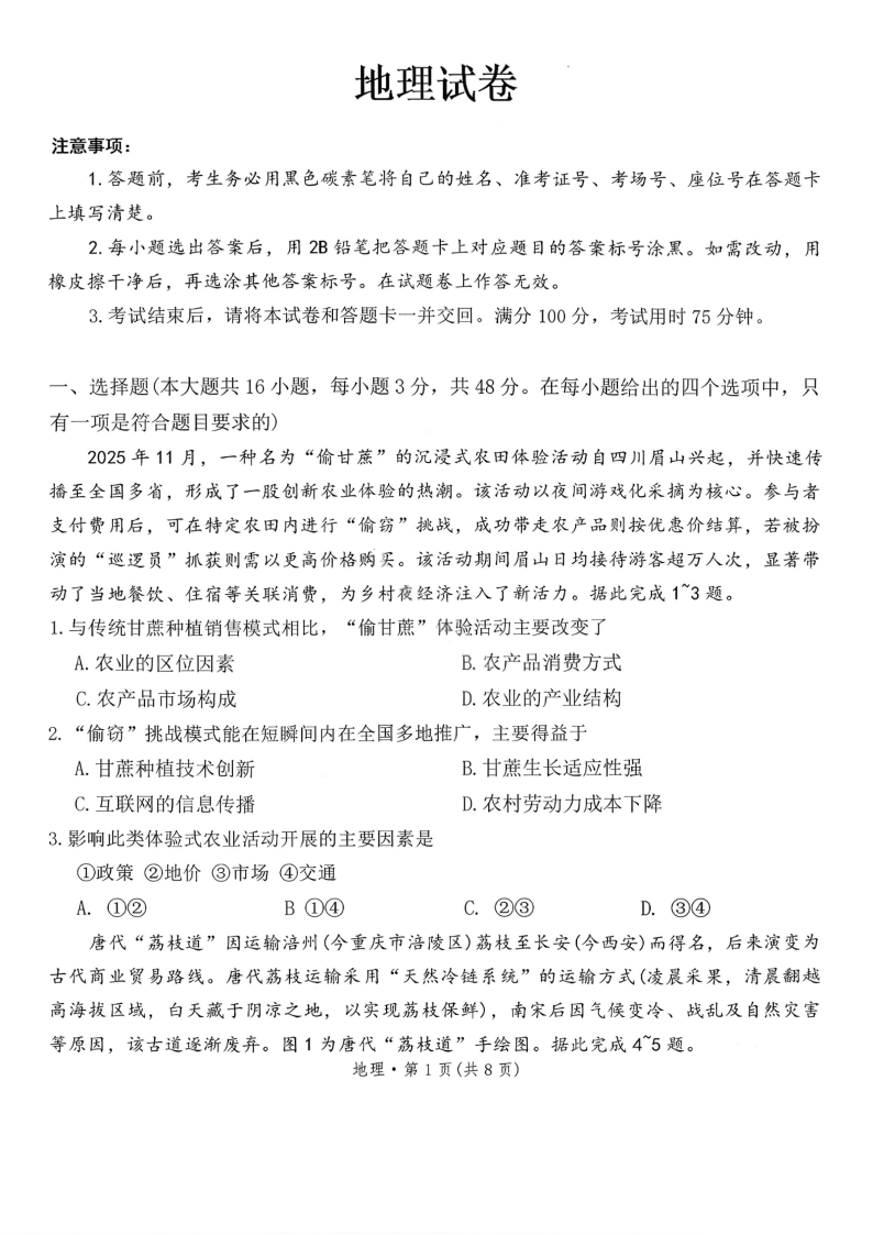 云南师范大学附属中学2026届高三1月高考适应性月考卷(六) 地理.pdf