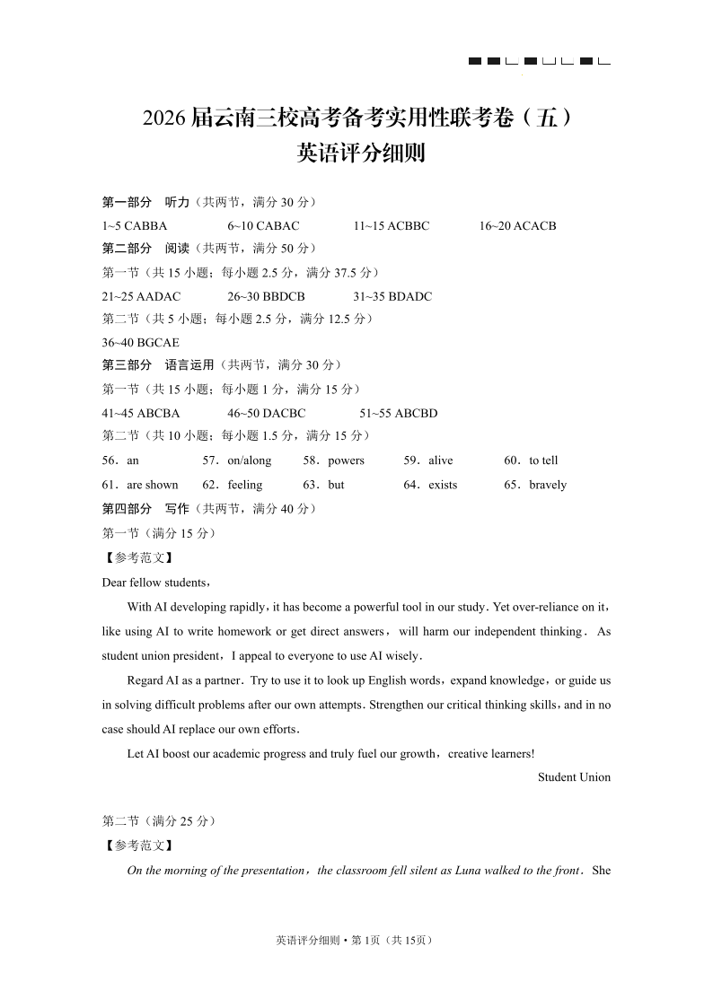 2026届云南三校高考备考实用性联考卷(五)英语答案.pdf