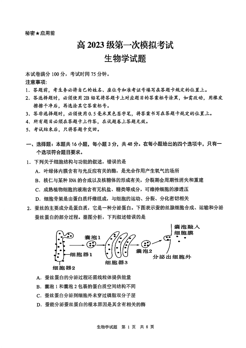 四川省广安市高2023级第一次模拟考试 生物.pdf