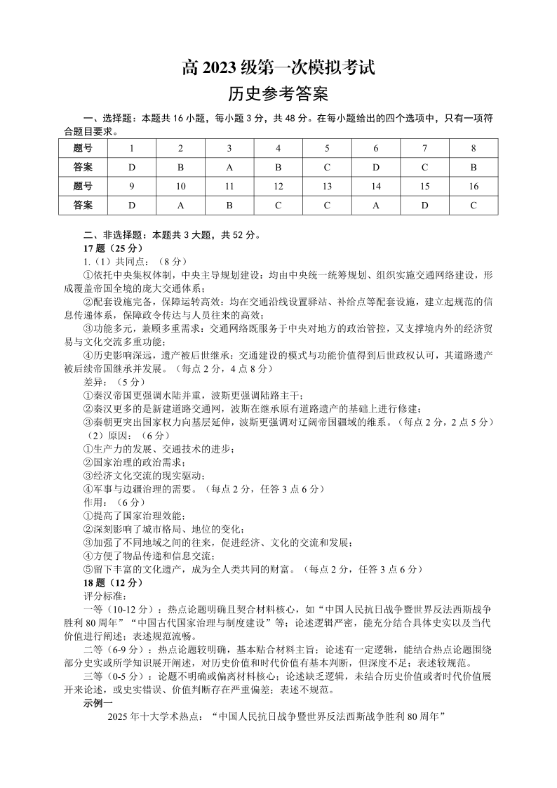 四川省广安市高2023级第一次模拟考试 历史答案.pdf