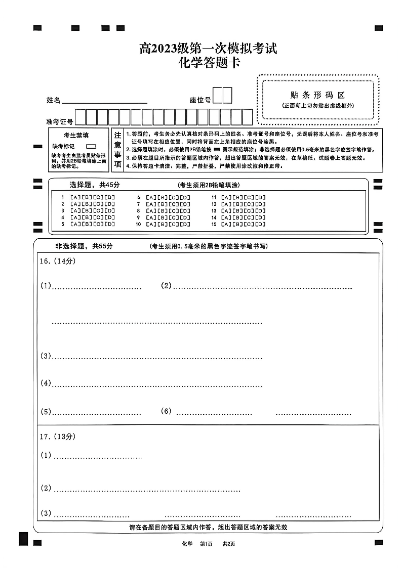 四川省广安市高2023级第一次模拟考试 化学答题卡.pdf