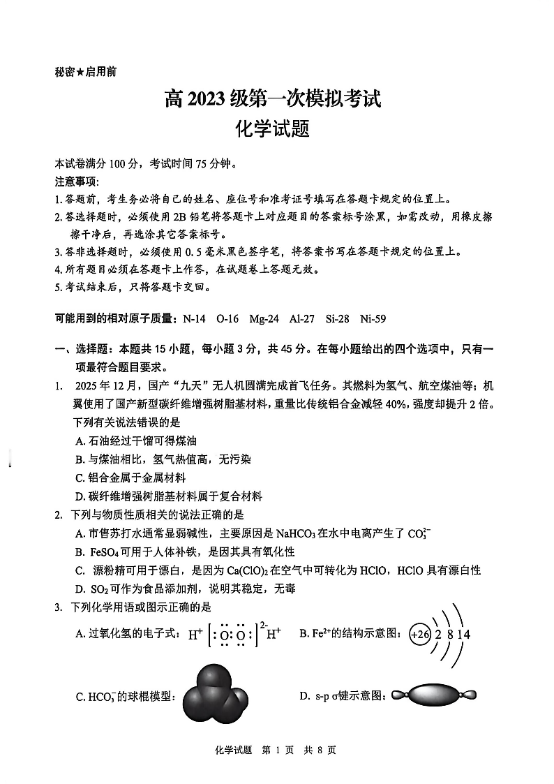 四川省广安市高2023级第一次模拟考试 化学.pdf