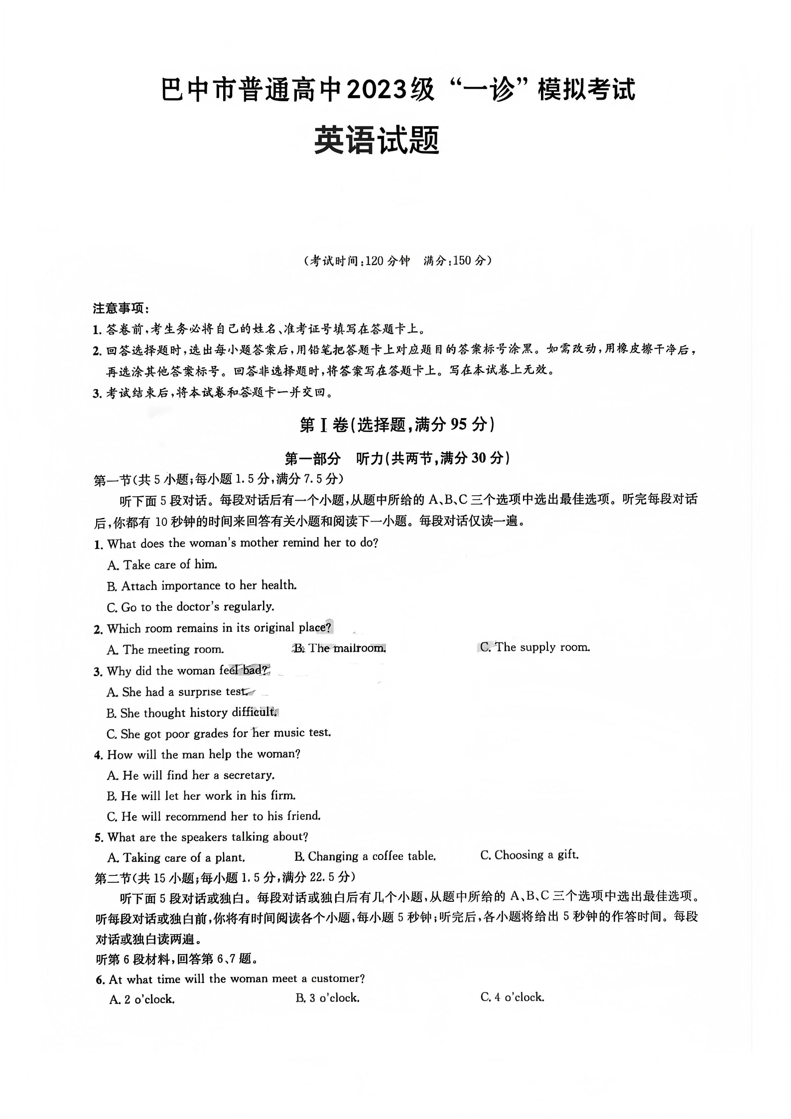 巴中市普通高中2023级“一诊”模拟考试 英语.pdf