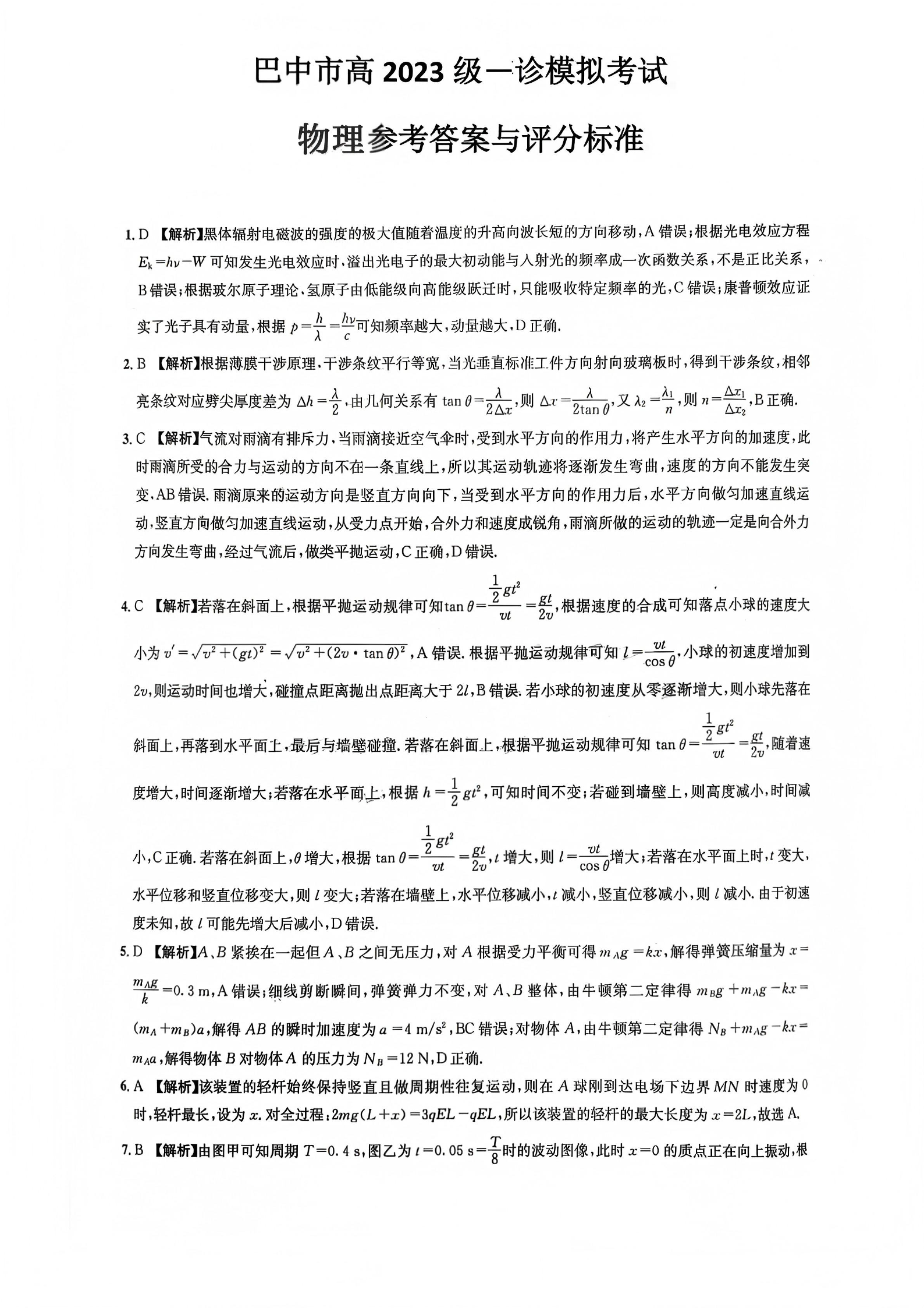 巴中市普通高中2023级“一诊”模拟考试 物理答案.pdf