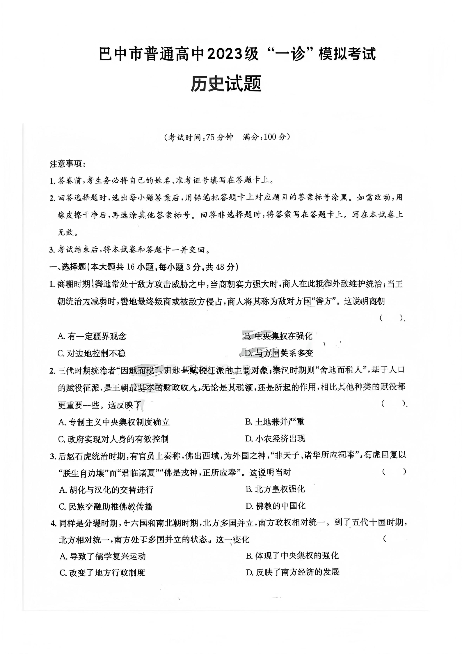巴中市普通高中2023级“一诊”模拟考试 历史.pdf
