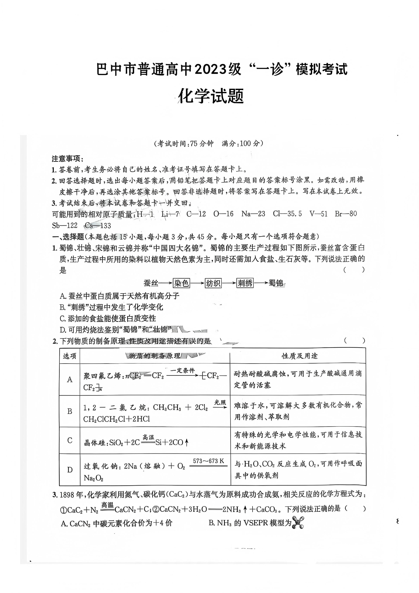 巴中市普通高中2023级“一诊”模拟考试 化学.pdf