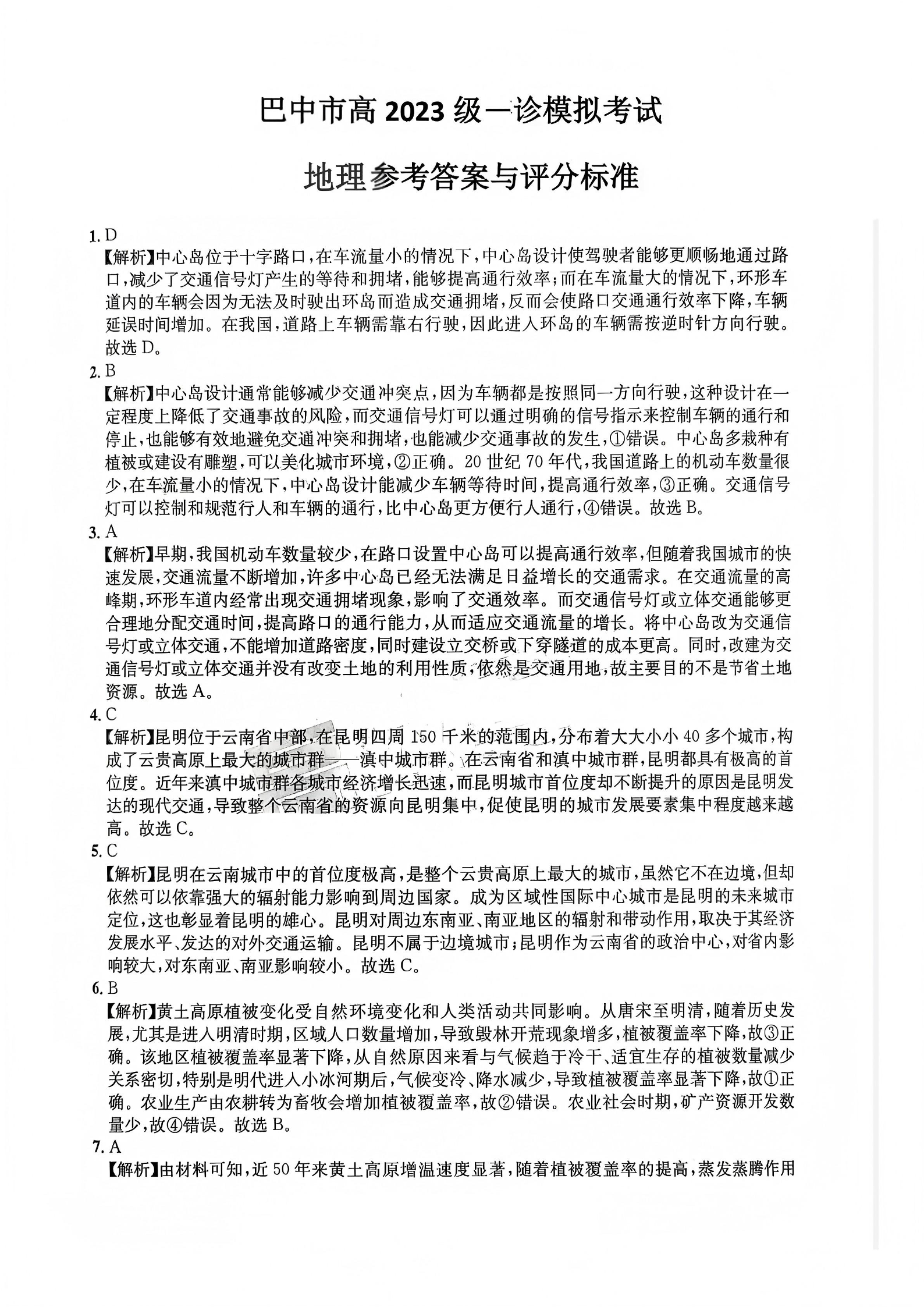 巴中市普通高中2023级“一诊”模拟考试 地理答案.pdf