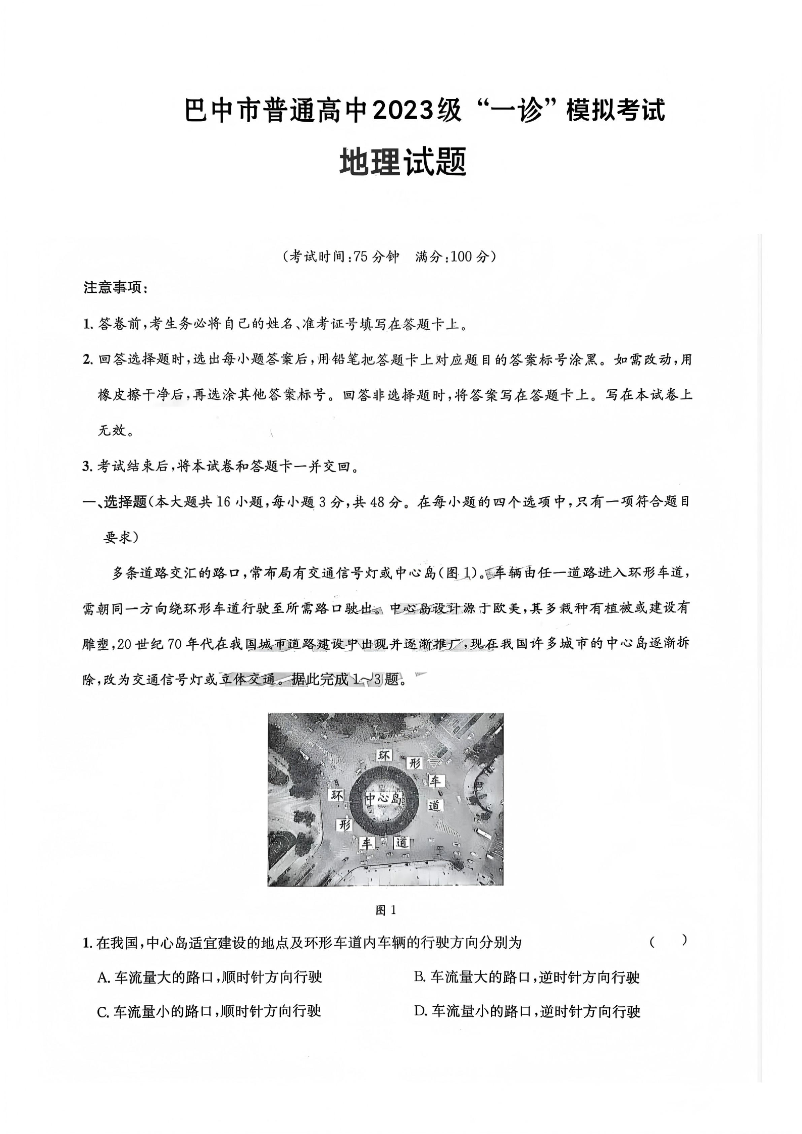 巴中市普通高中2023级“一诊”模拟考试 地理.pdf