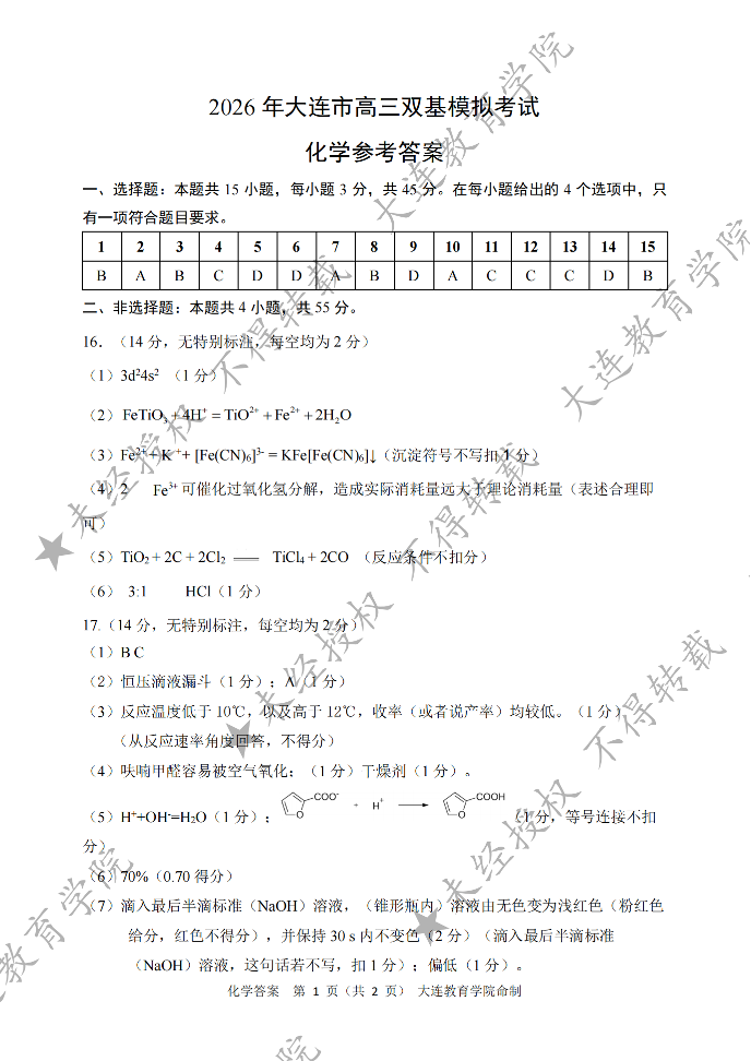 2026年大连市高三双基模拟考试 化学答案.pdf
