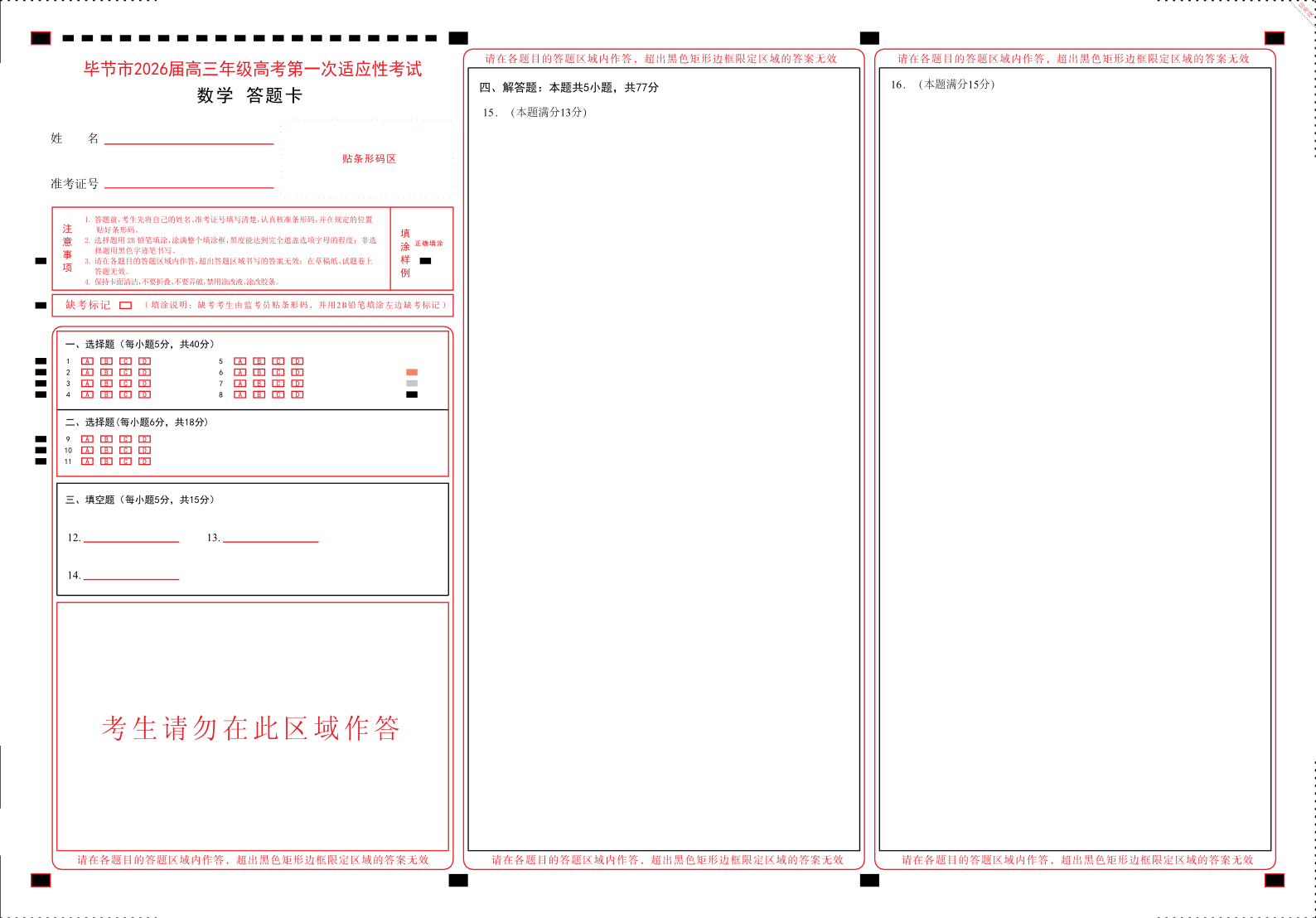 贵州省毕节市2026届高三年级高考第一次适应性考试 数学答卡.pdf