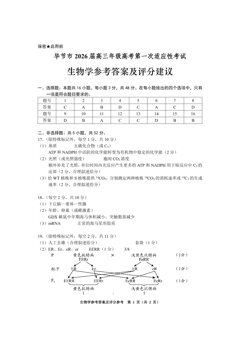贵州省毕节市2026届高三年级高考第一次适应性考试 生物答案.pdf