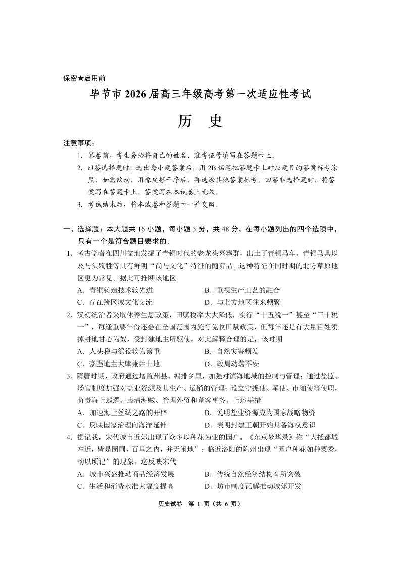 贵州省毕节市2026届高三年级高考第一次适应性考试 历史.pdf