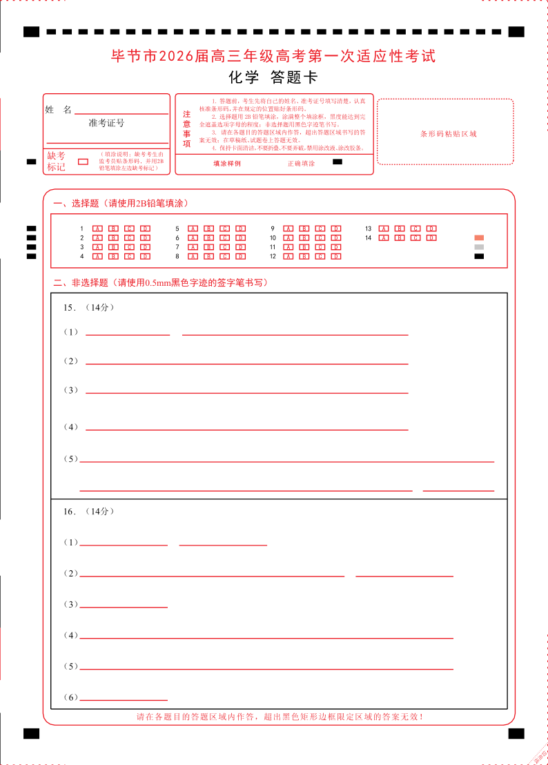 贵州省毕节市2026届高三年级高考第一次适应性考试 化学答卡.pdf