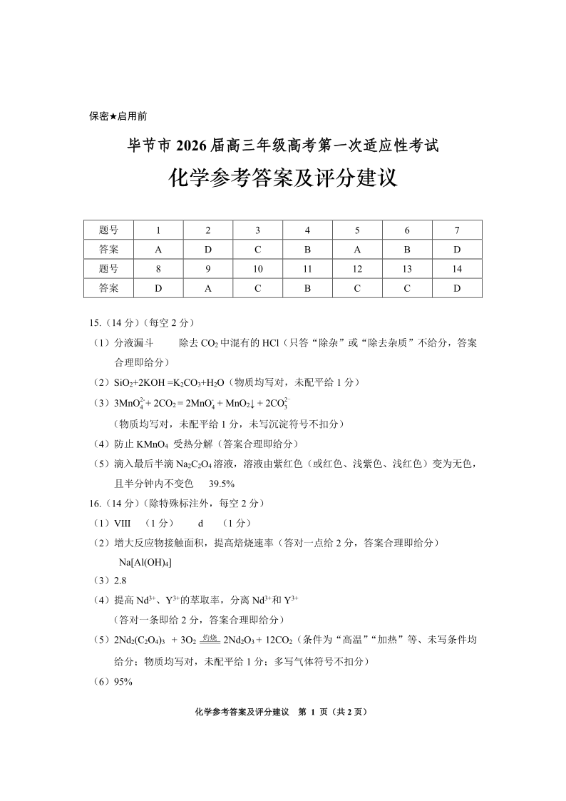 贵州省毕节市2026届高三年级高考第一次适应性考试 化学答案.pdf