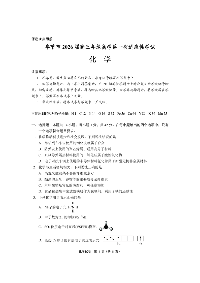 贵州省毕节市2026届高三年级高考第一次适应性考试 化学.pdf