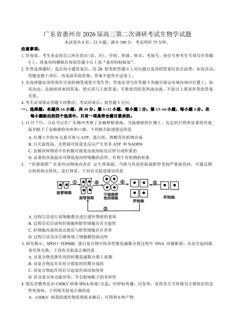 广东省惠州市2026届高三第二次调研考试 生物试题(含答案).pdf
