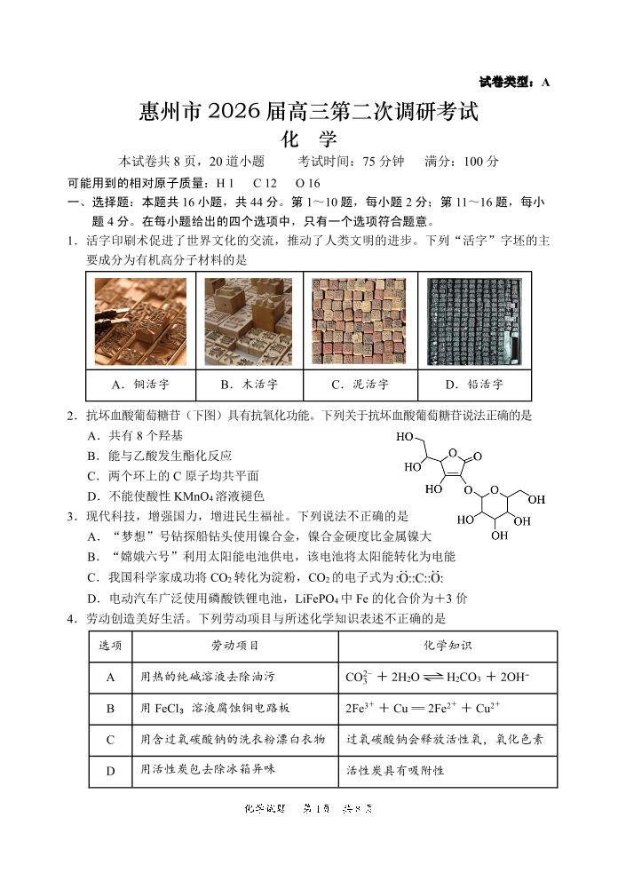 广东省惠州市2026届高三第二次调研考试 化学试题(含答案).pdf