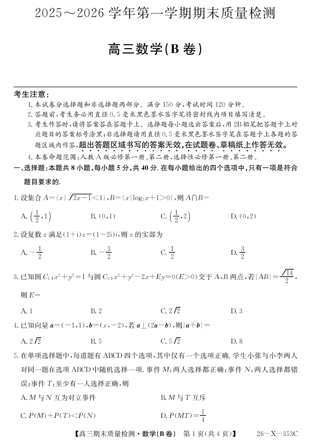 安徽省县域合作共享联盟2025-2026学年高三上学期1月期末质量检测-数学(B卷).pdf