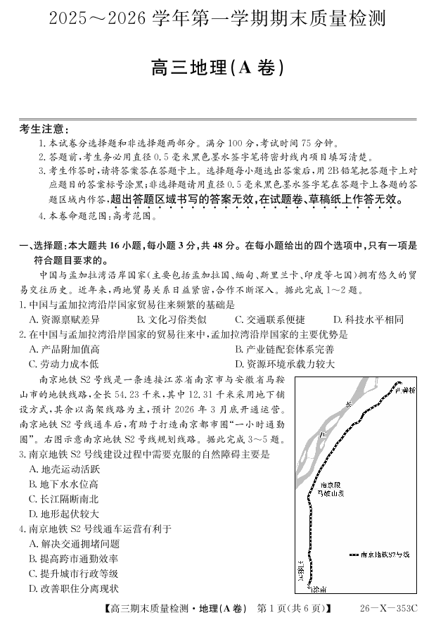 安徽省县域合作共享联盟2025-2026学年高三上学期1月期末质量检测-地理(A卷).pdf