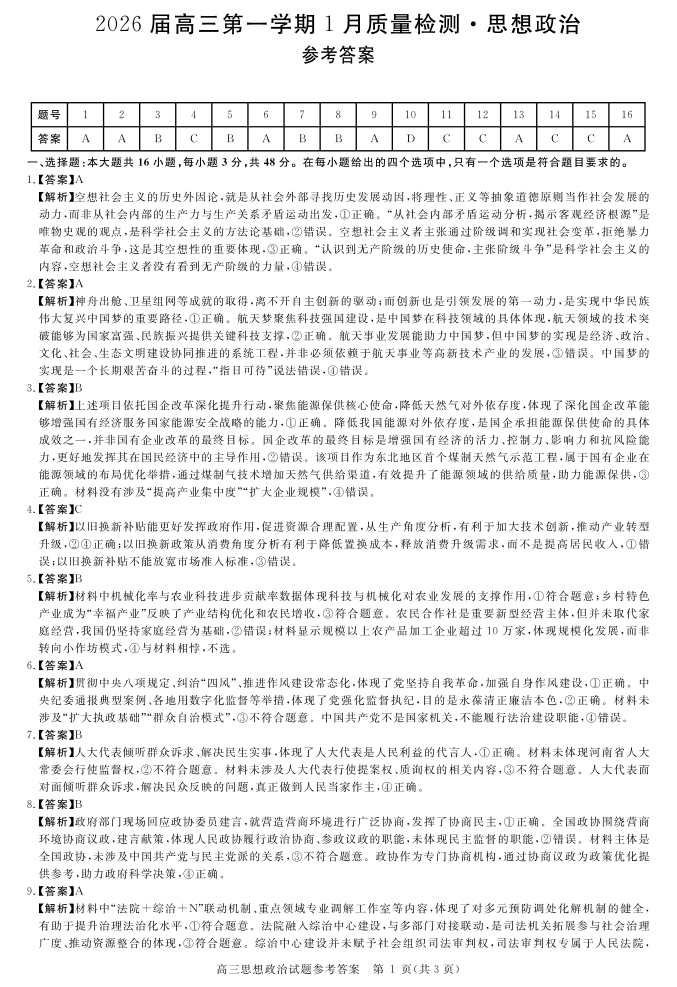 安徽省华师联盟2025-2026学年高三上学期1月质量检测-政治答案.pdf
