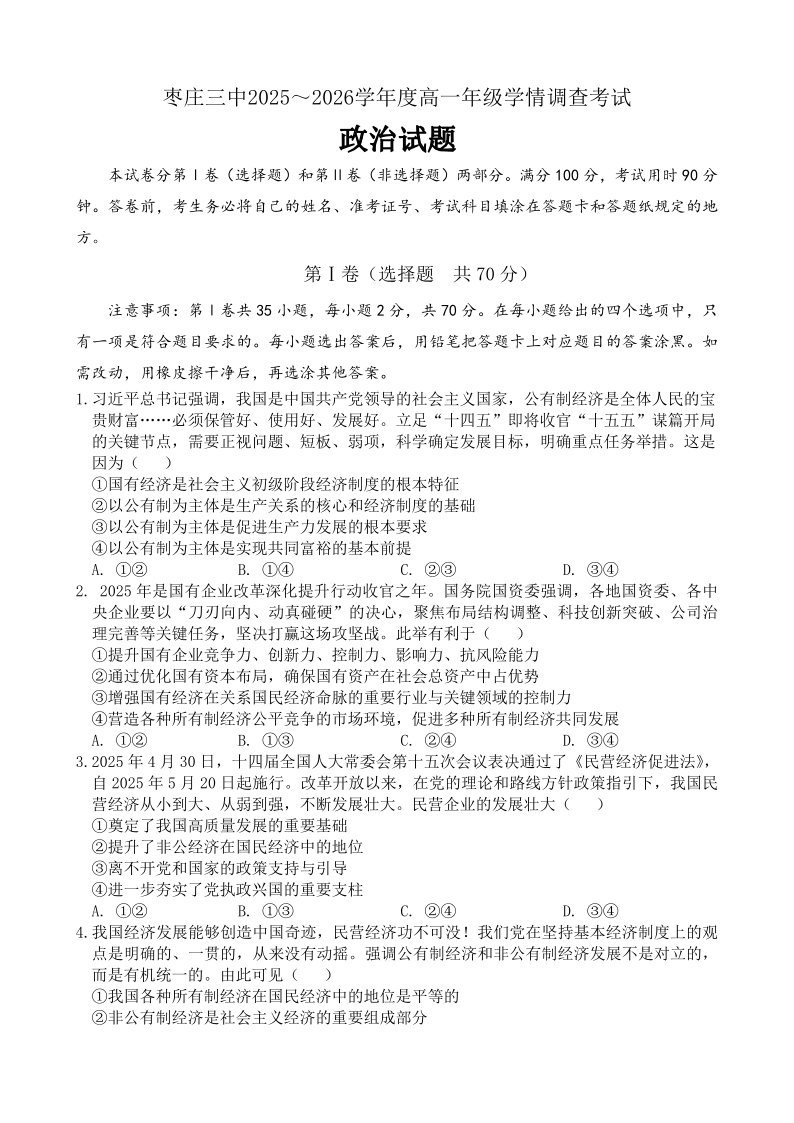 枣庄三中2025-2026学年高一年级上学期学情调查考试 政治试题(含答案).pdf