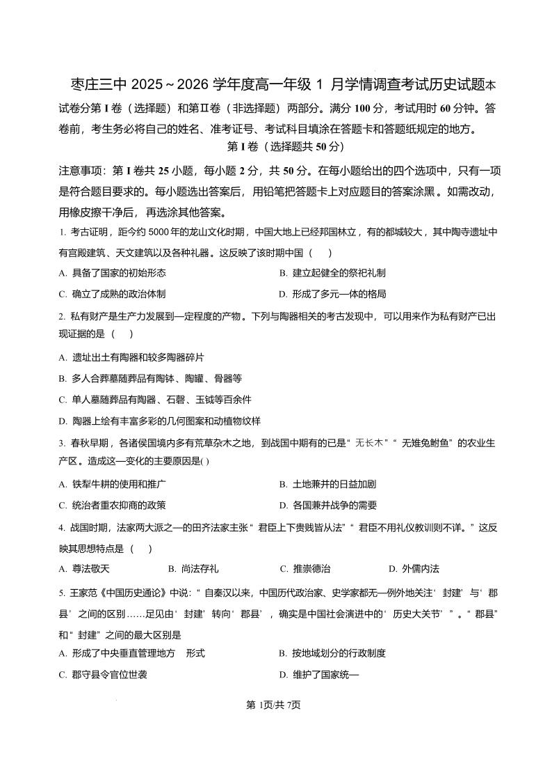 枣庄三中2025-2026学年高一年级上学期学情调查考试 历史试题(含答案).pdf