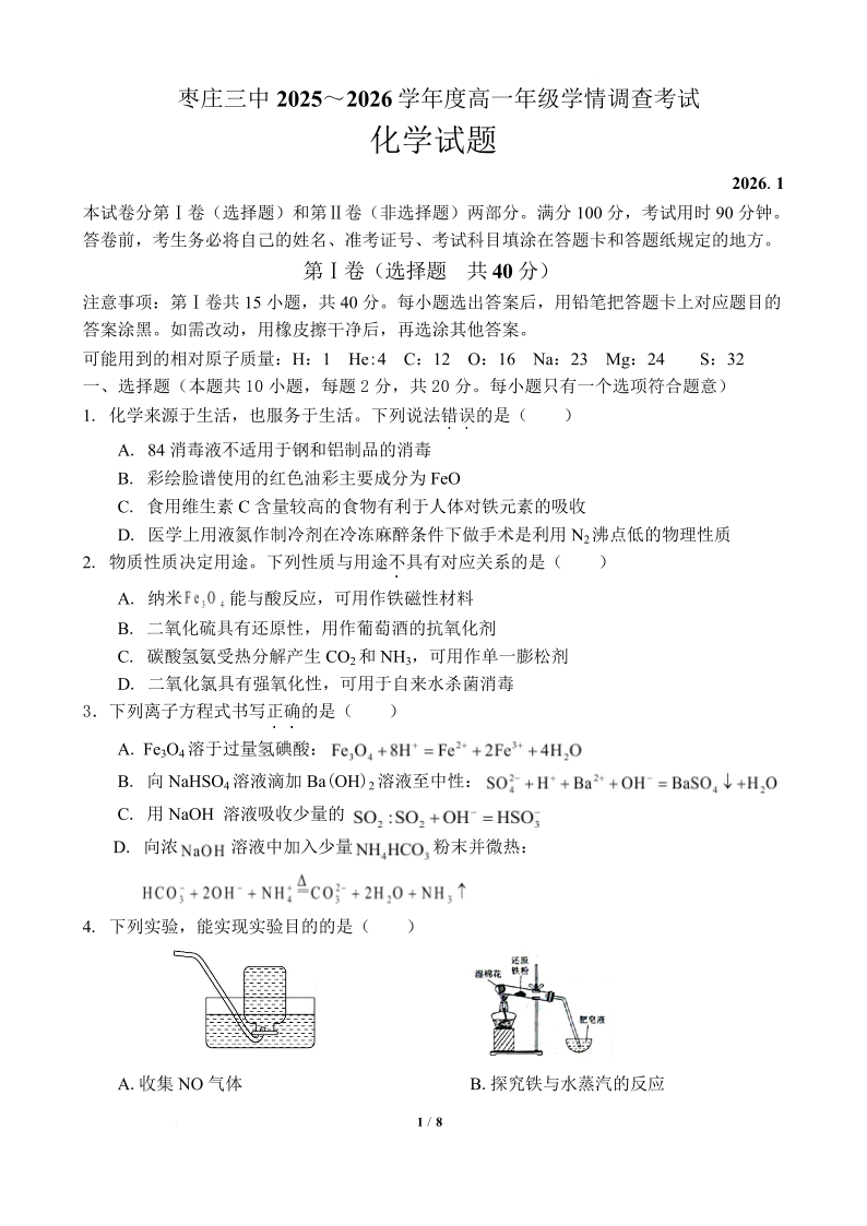 枣庄三中2025-2026学年高一年级上学期学情调查考试 化学试题(含答案).pdf