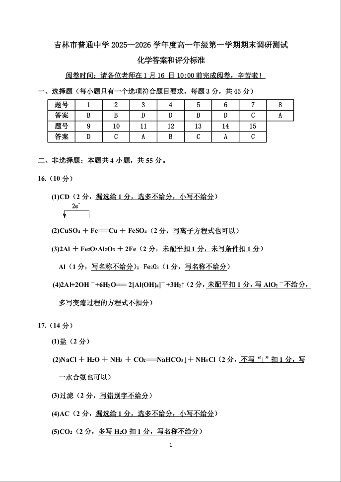 吉林省吉林市2025-2026学年高一上学期期末考试 化学答案.docx