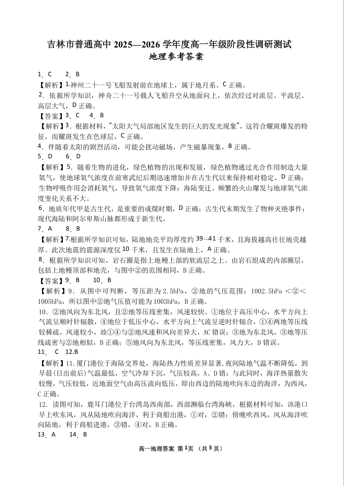 吉林省吉林市2025-2026学年高一上学期期末考试 地理答案.docx