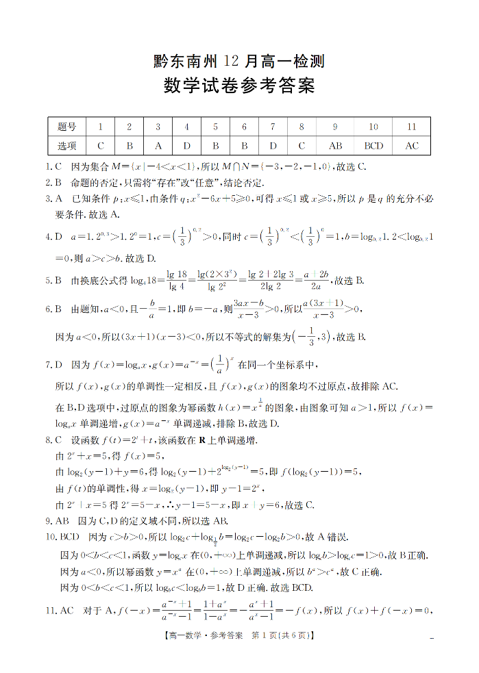 黔东南州2025-2026学年高一上学期12月检测 数学答案.pdf
