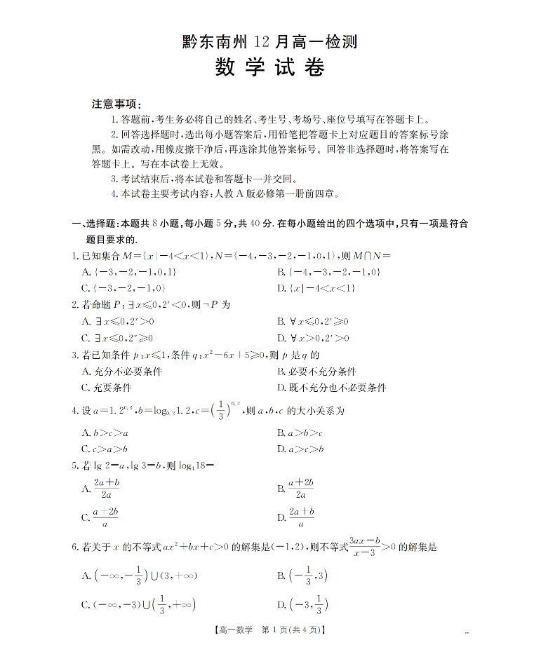 黔东南州2025-2026学年高一上学期12月检测 数学.pdf