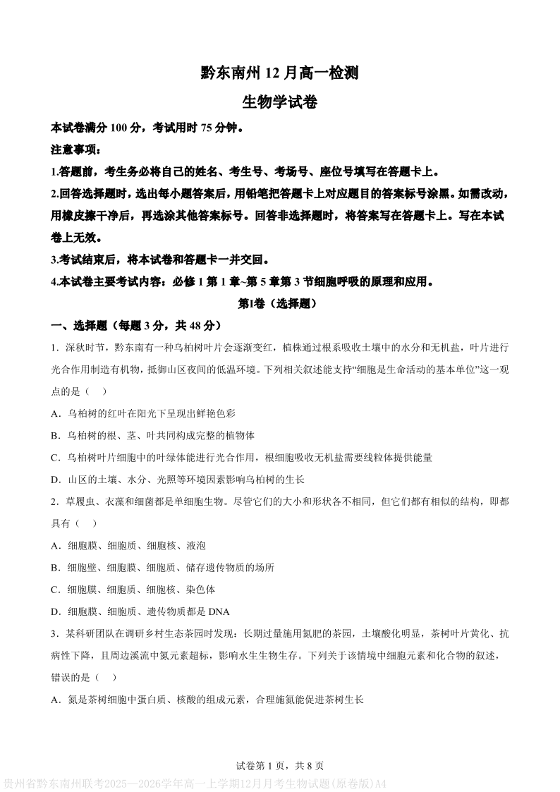 黔东南州2025-2026学年高一上学期12月检测 生物.pdf