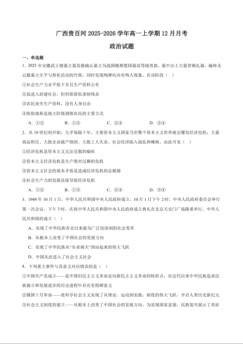 广西2025级“贵百河”12月高一年级新高考月考测试 政治试题(含答案).docx