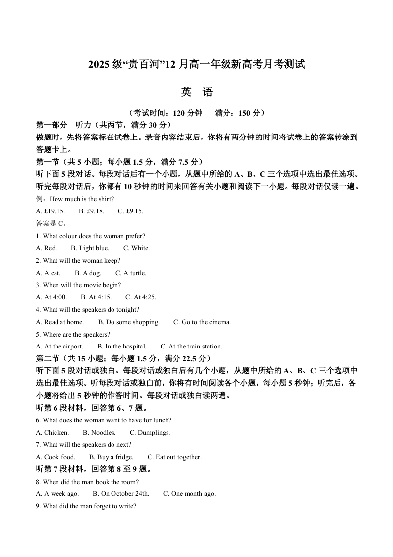 广西2025级“贵百河”12月高一年级新高考月考测试 英语试题(含答案).docx