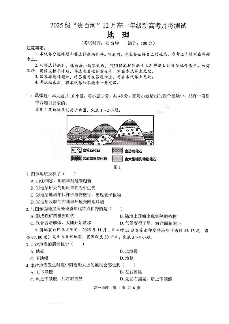 广西2025级“贵百河”12月高一年级新高考月考测试 地理试题(含答案).pdf