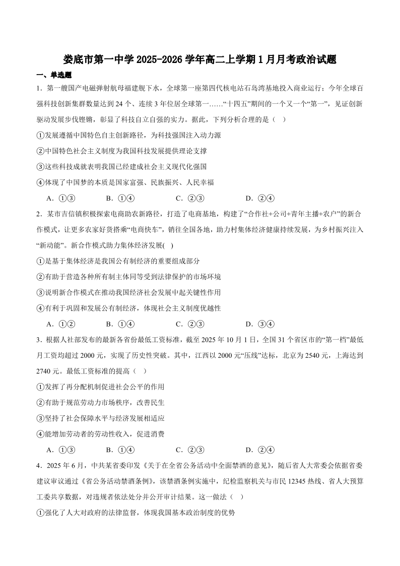 湖南省娄底一中2025年秋季学期高二年级1月月考 政治试题(含答案).pdf
