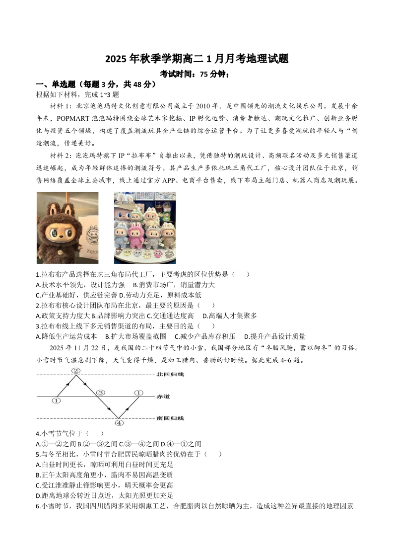 湖南省娄底一中2025年秋季学期高二年级1月月考 地理试题(含答案).pdf
