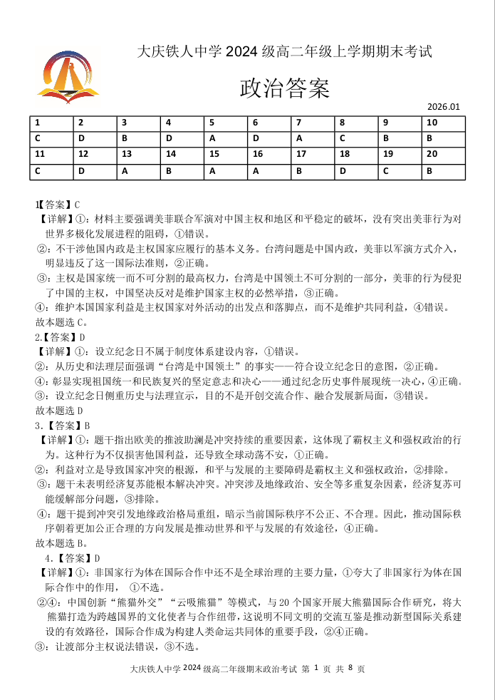 大庆铁人中学2025-2026学年高二上学期期末考试 政治答案.docx