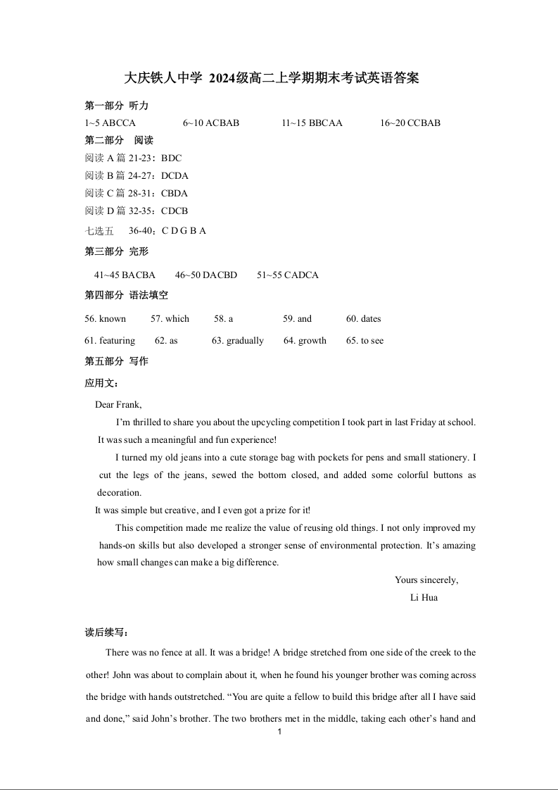 大庆铁人中学2025-2026学年高二上学期期末考试 英语答案.docx